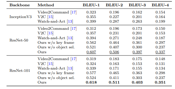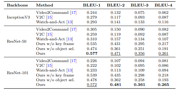 | Video-to-command generation performance (BLEU scores) on standard object sets (bold and underline are best and second best, respectively). | |